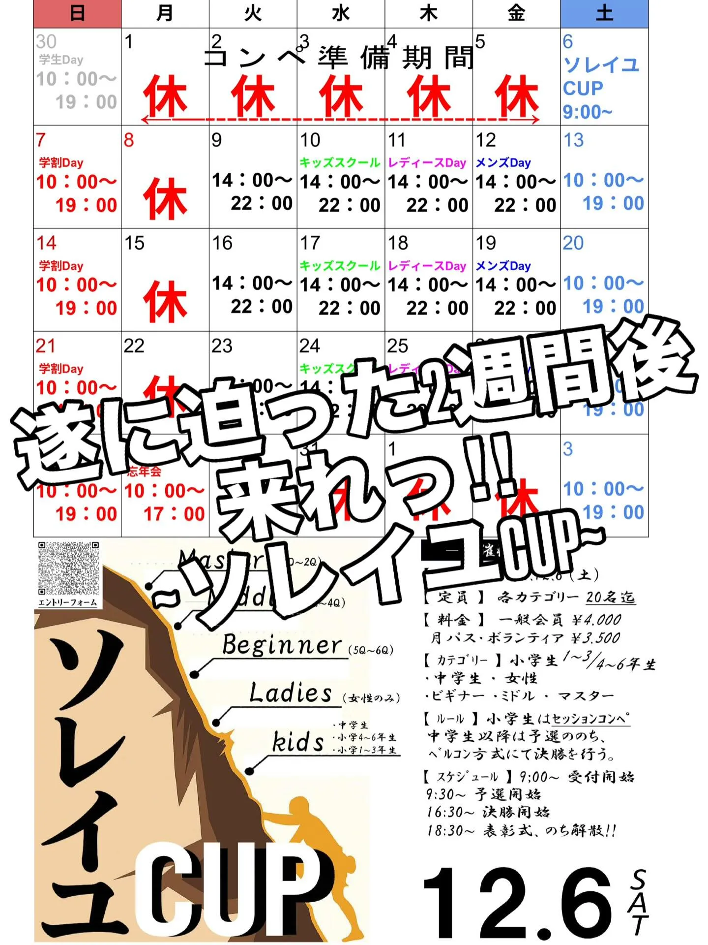 12月営業カレンダー 12月営業カレンダー12月は遂に、ソレイユCUP開催🔥🔥日頃のトレーニングの成果をブチかませっ👊そして、年末年始の営業はこちら…12/2910:00〜17:00忘年会🍺12/30〜1/2年末年始のお休み1/310:00〜19:00🎍12/29…