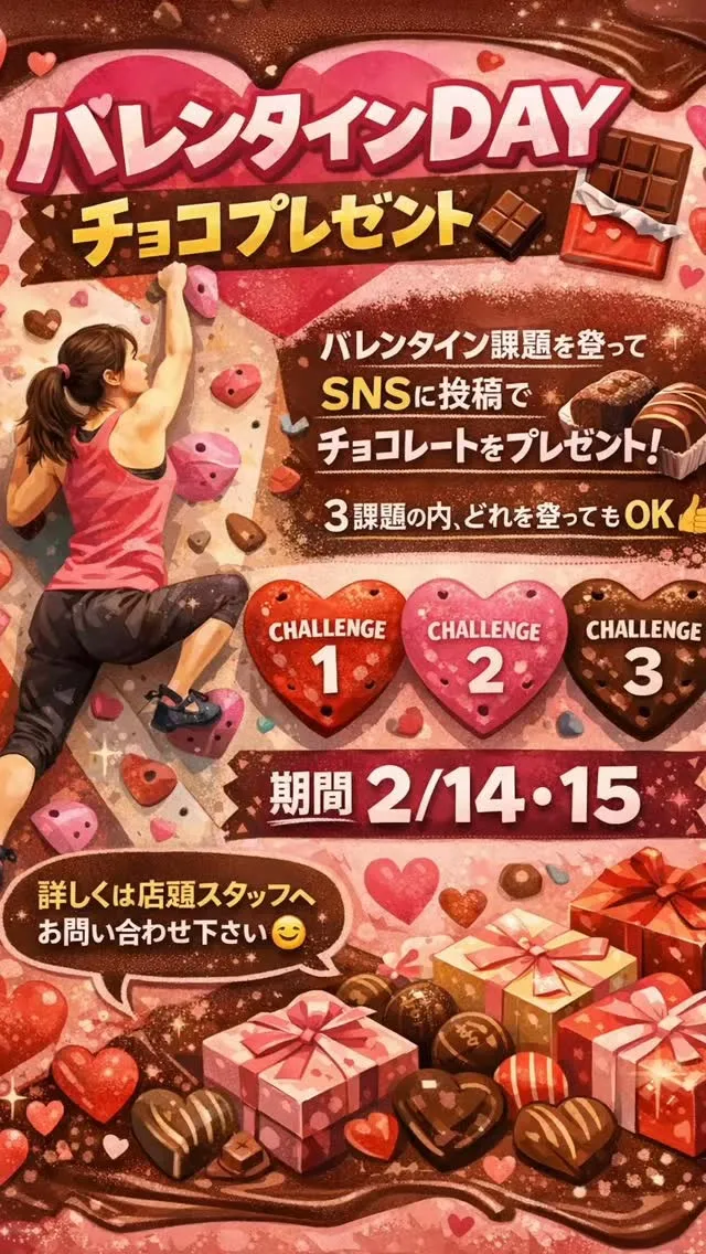 2/14 (土) OPEN 10:00~19:00 CLOS... 2/14(土)OPEN10:00~19:00CLOSED💝本日はバレンタインDAY💝バレンタイン課題完登&SNS投稿で、店長から愛を込めてチョコレート🍫をプレゼント😆子供から大人まで、誰でも登れる課題をご用意しておりますので皆…